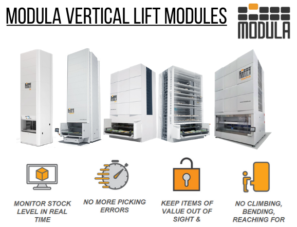 Available in a wide range of sizes and capacities, Modula Lift is the ideal storage solution for industrial products, components and spare parts for all possible environments and industries. With a throughput of up to 130 trays per hour and a tray payload capacity of up to 2,200 lbs, it’s a workhorse of a machine. Like all our VLMs, the Lift can dramatically reduce your space requirements (up to 90%) while increasing the speed, efficiency, and accuracy of your picking operations.