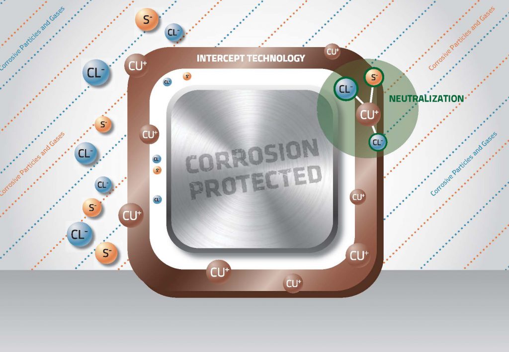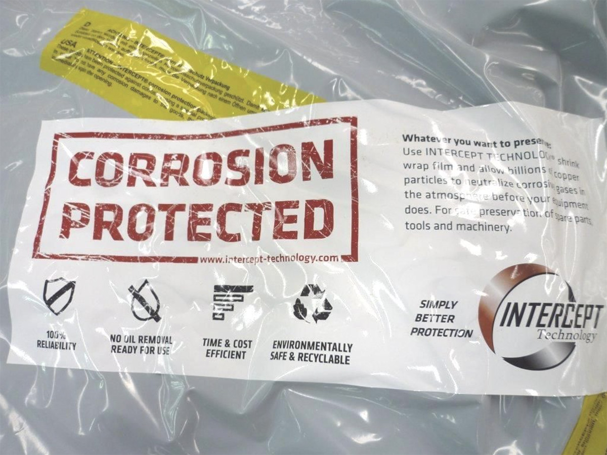 INTERCEPT Technology™ (sometimes referred to as Reactive Copper Polymer) is a copper-based scavenging corrosion protection packaging method. This system eliminates the need for secondary protection such as oils, waxes, or harmful solvents thus creating safer and cleaner working environments.